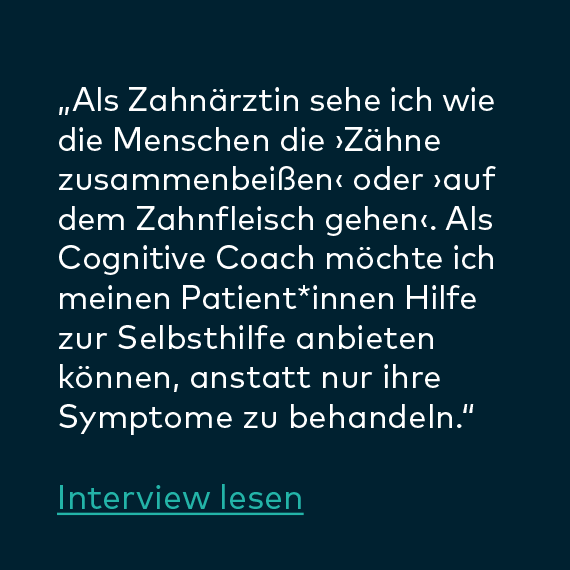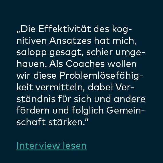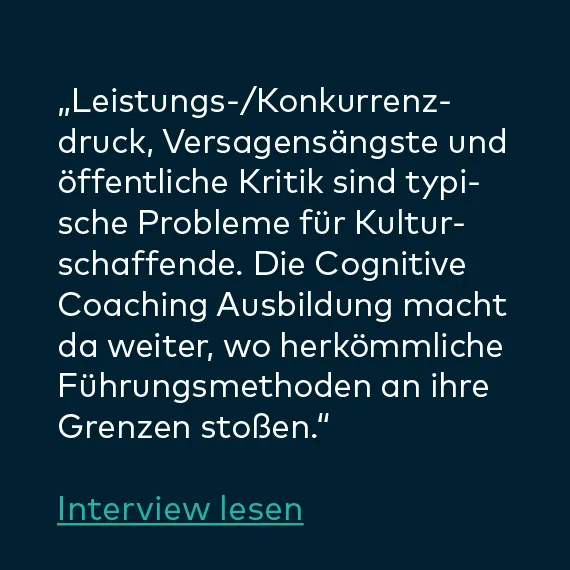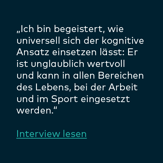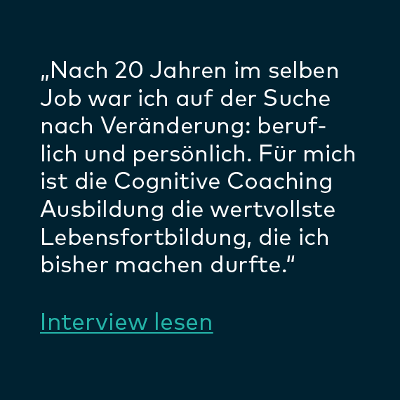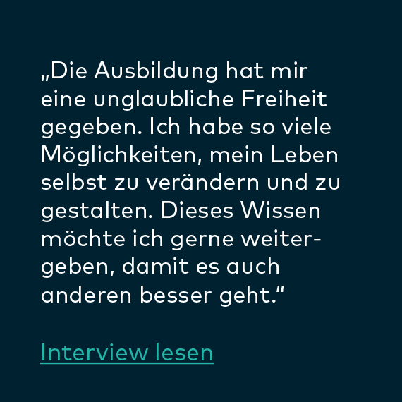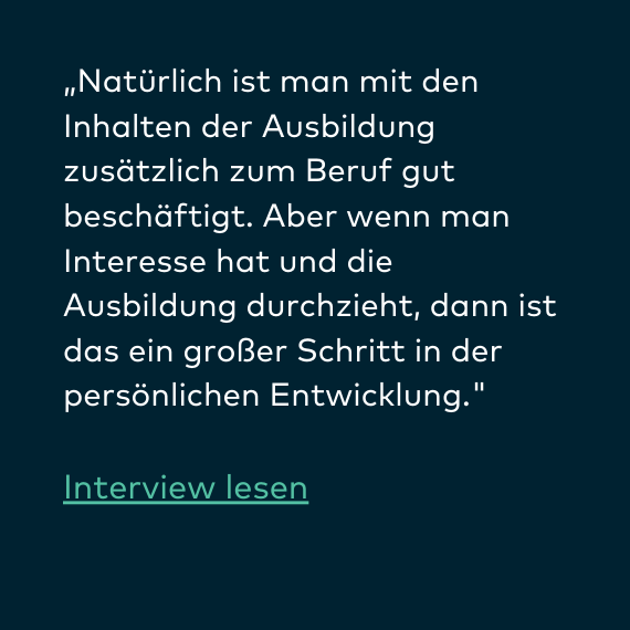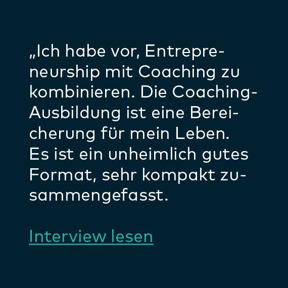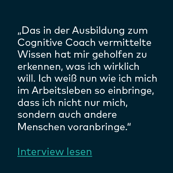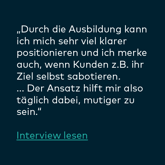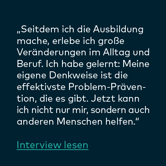 „Die Ausbildung hat mein Leben privat wie beruflich, sprich in allen Lebenssituationen bereichert. Ich bin sehr froh darüber, dass ich sie durchführe. Meine Erwartungen wurden übertroffen. Ich bin emotional stabiler und ausgeglichener als je zuvor. Es ist eine lohnende und langfristige Investition für ein zufriedenes Leben.“