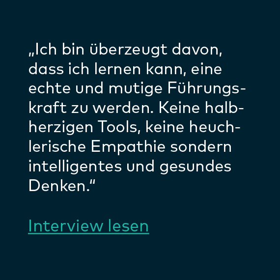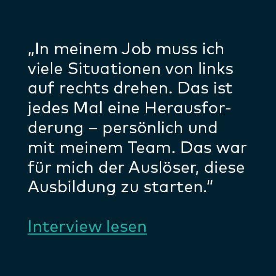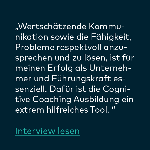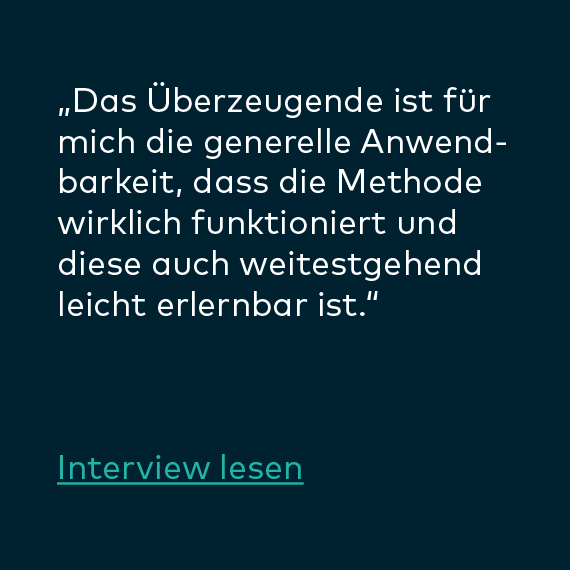 „Die erste Ausbildungsstufe im Herbst 2018 brachte schon viele Erkenntnisse; ’so einfach‘ und doch so effizient. Ich bin offener und ausgeglichener. Aussagen meiner Mitarbeiter nehme ich aufmerksamer wahr. Dadurch kann ich individuelle Wege aufzeigen, die sowohl dem Mitarbeiter als auch dem Projekt dienen.“
