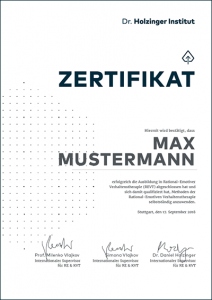 Alle anderen Ausbildungsteilnehmer erhalten ein Zertifikat des Dr. Holzinger Instituts, das sich an den Standards der RE&KVT (Albert Ellis Institute, NY) und denen der DGPPN ausrichtet.